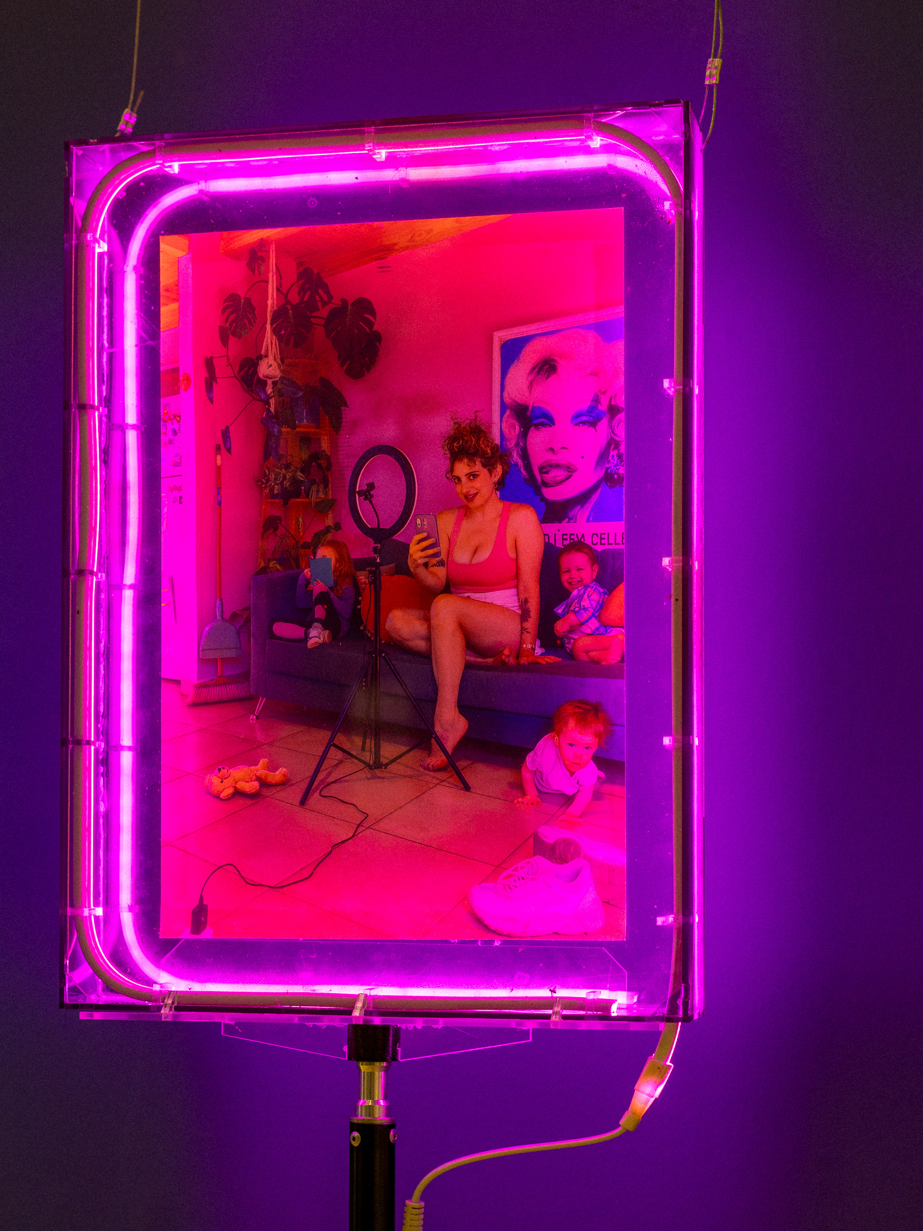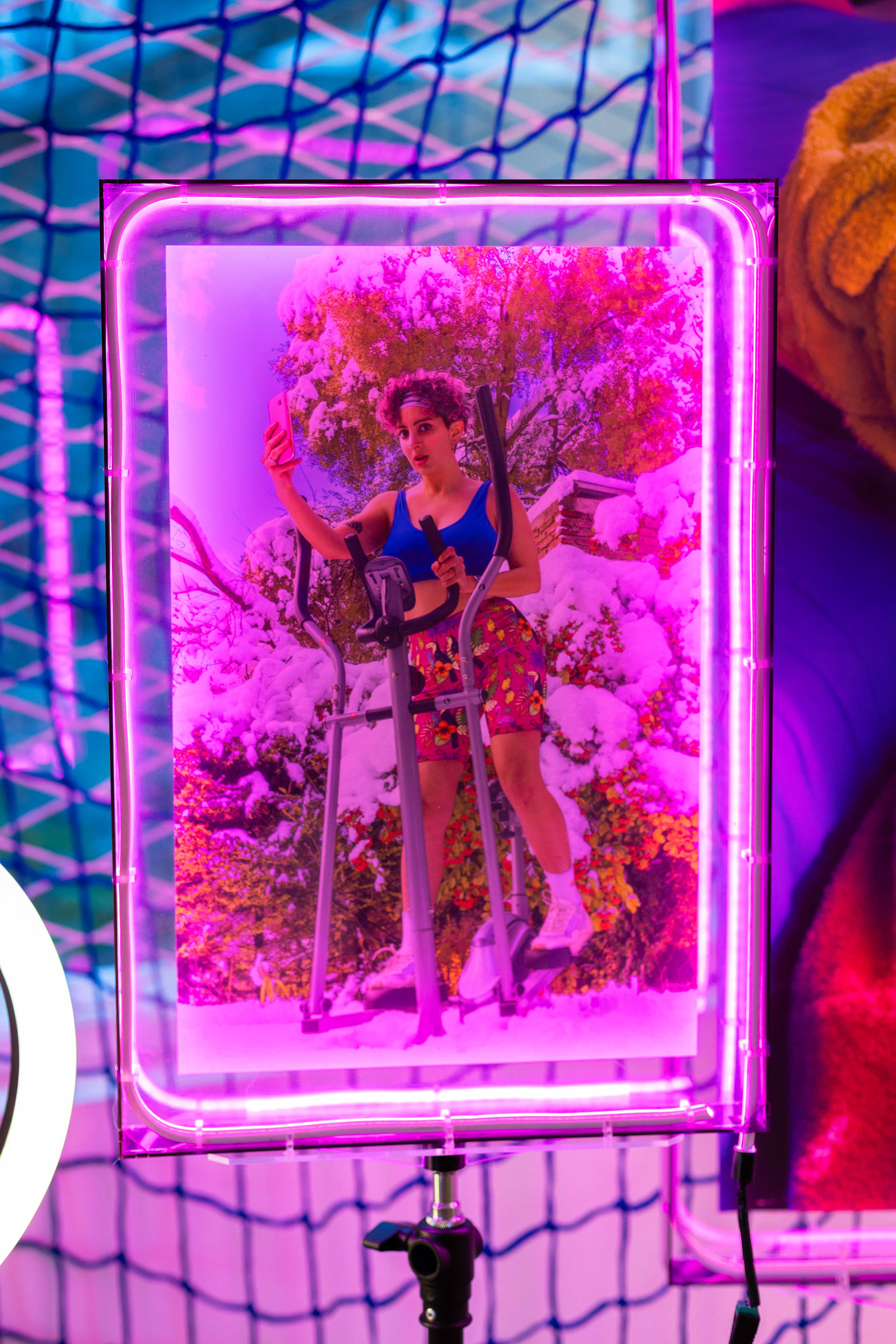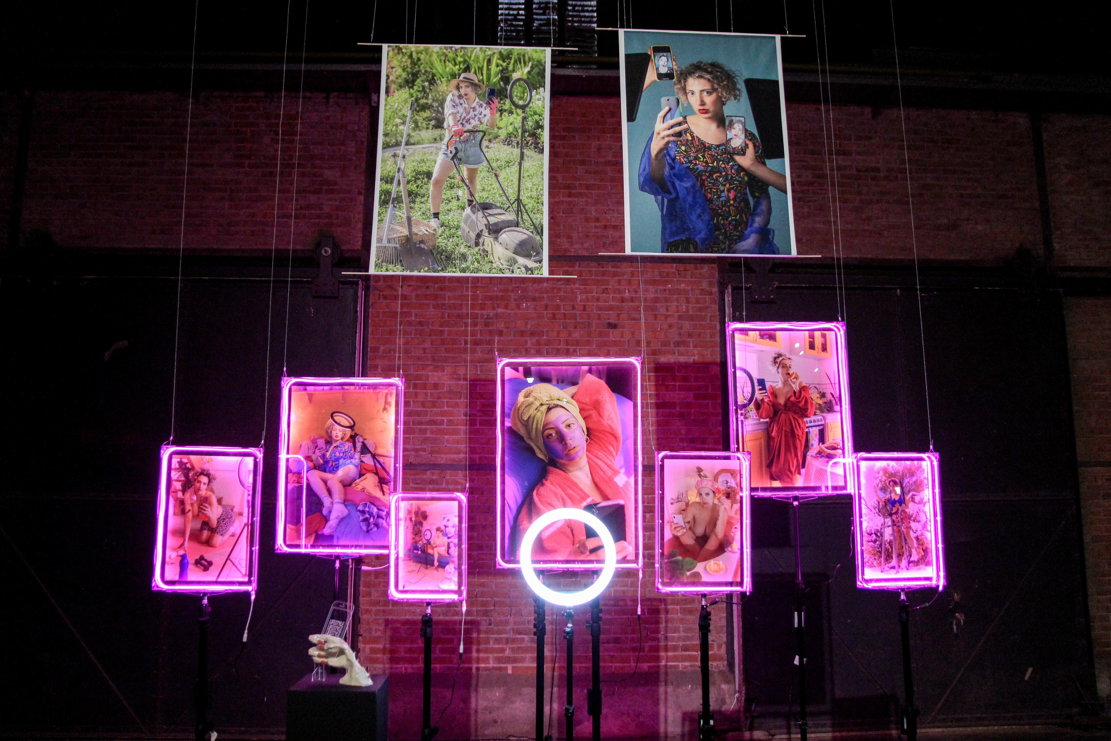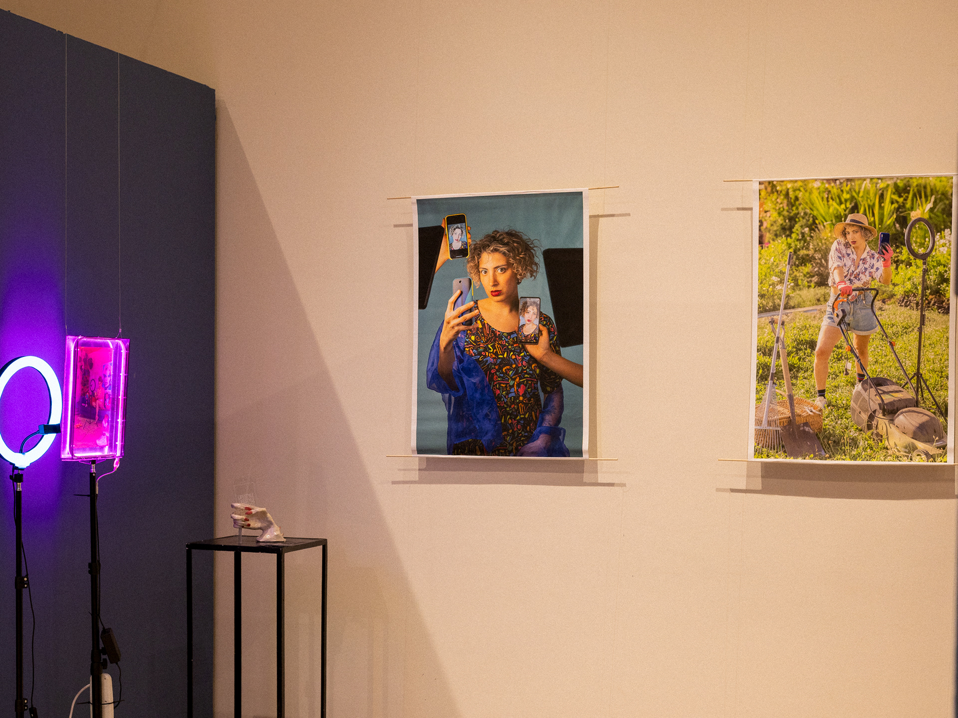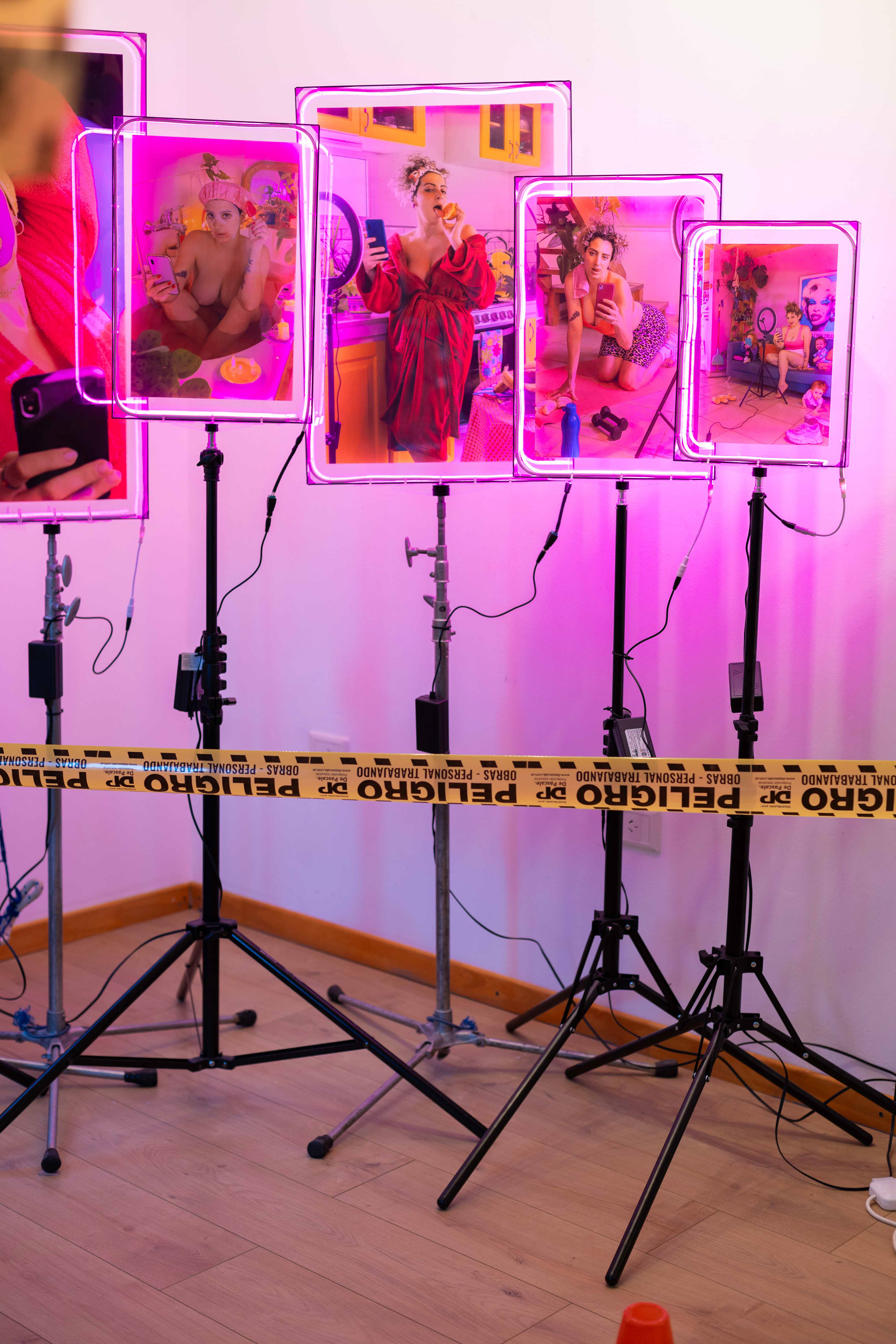 Las obras se presentan en distintos formatos y dispositivos expositivos que combinan imagen, objeto y luz. Las fotografías están montadas sobre estructuras de acrílico iluminadas con tiras de luz LED rosada, sostenidas por trípodes de iluminación y sistemas de sujeción al techo, reforzando el vínculo entre la estética del set fotográfico y la puesta en escena expositiva.
