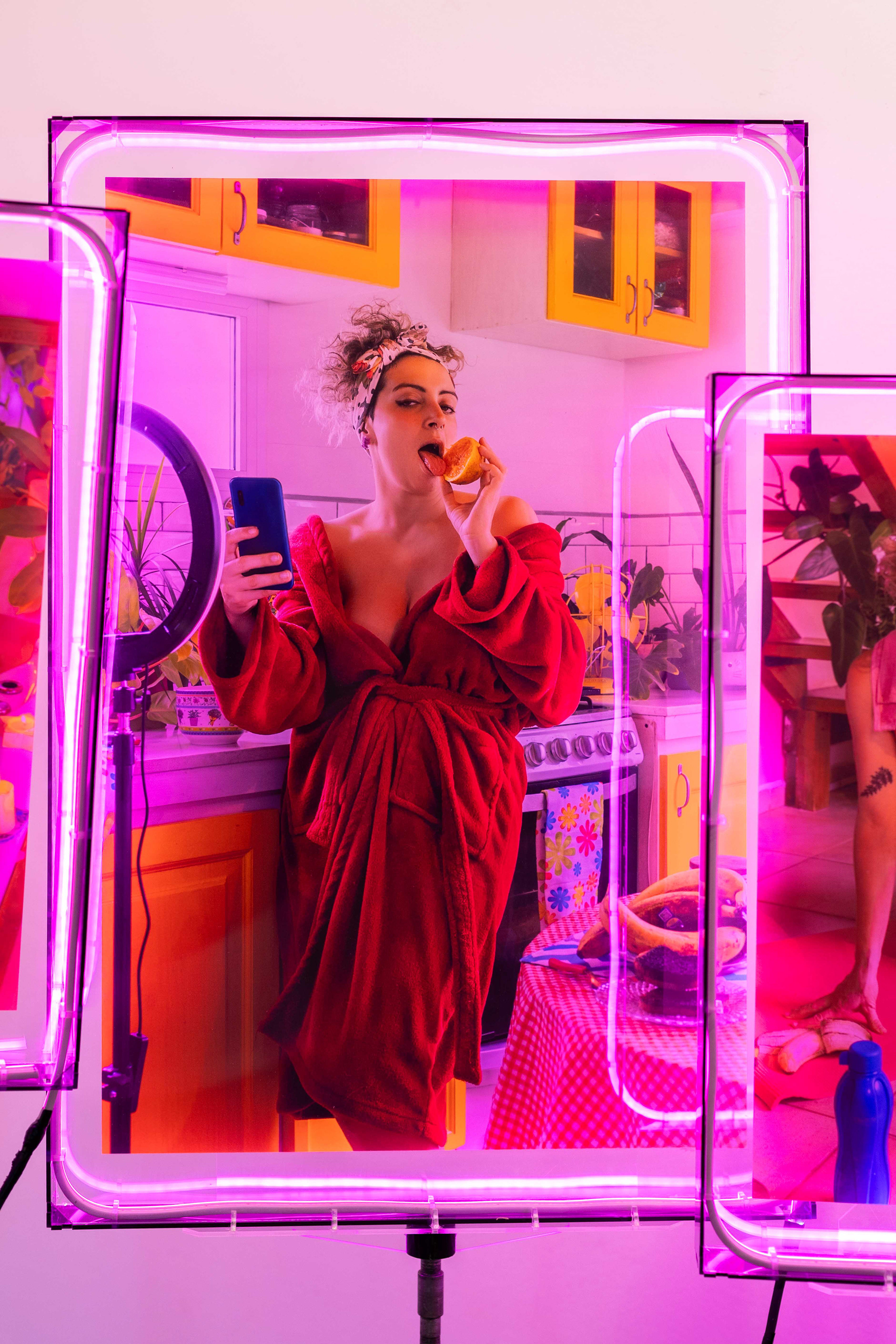 La serie combina improvisación y puesta en escena. A partir del autorretrato, construyo escenarios, vestuarios y tratamientos de color que exageran los códigos visuales de las redes. El mayor desafío no fue técnico, sino convivir con el personaje que inventé: una figura que por momentos disfruté y por momentos rechacé. Esa tensión es parte central del trabajo.